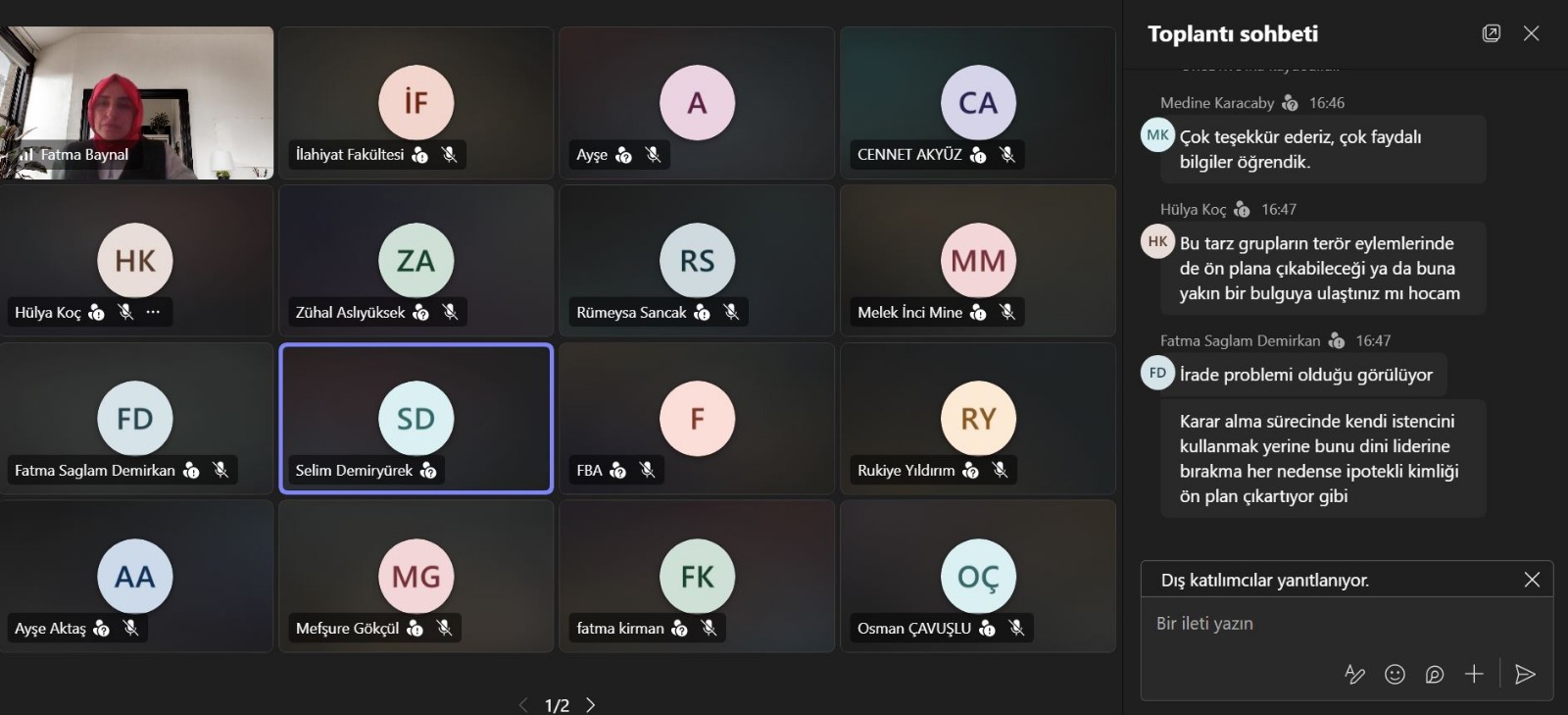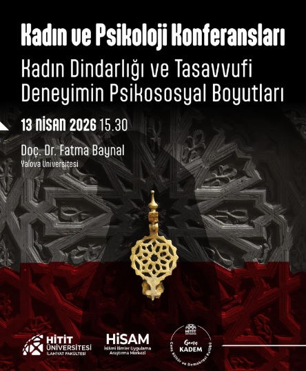 Fakültemiz Din Psikolojisi Anabilim dalı öğretim üyesi Doç. Dr. Fatma Baynal, Hitit Üniversitesi İlahiyat Fakültesi tarafından düzenlenen bir etkinlikte kadın dindarlığı üzerine online bir konferans verdi. "Kadın ve Psikoloji Konferansları" başlıklı etkinliğin 13 Nisan 2026 günkü oturumunda Doç. Dr. Baynal, "Kadın Dindarlığı ve Tasavvufi Deneyimin Psikososyal Boyutları" başlıklı bir sunum yaptı.