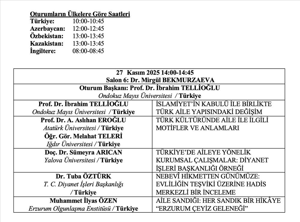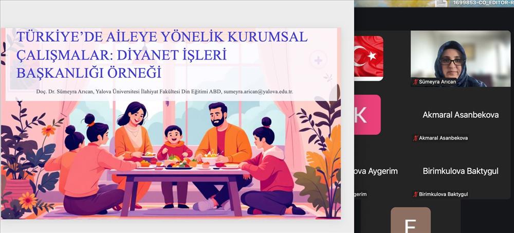 Fakültemiz öğretim üyesi Doç. Dr. Sümeyra Arıcan 26-27 Kasım 2025 tarihleri arasında Kırgızistan'ın Bişkek şehrinde düzenlenen II. Uluslararası Aile ve Değerler Sempozyumu’na “Türkiye’de Aileye Yönelik Kurumsal Çalışmalar: Diyanet İşleri Başkanlığı Örneği” başlıklı bildirisiyle online katılım sağlamıştır.