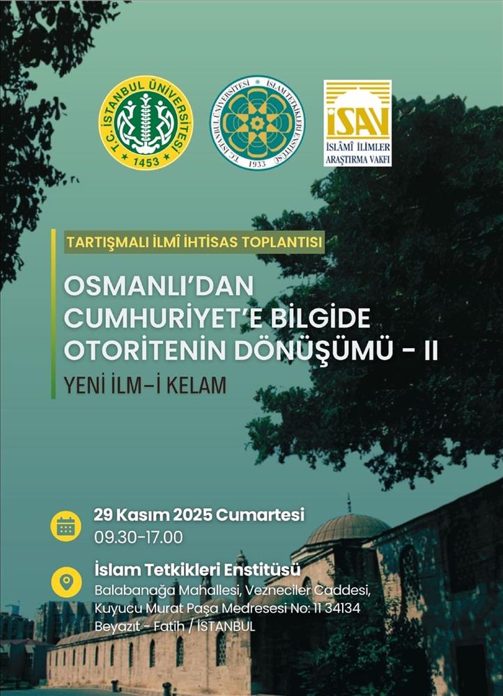 Fakültemiz Kelam Anabilim Dalı'ndan Dr. Öğr. Üyesi Ahmet Süruri, İstanbul Üniversitesi İslam Tetkikleri Enstitüsü ve İslam Araştırmaları Vakfı (İSAV) tarafından 29 Kasım 2025 Cumartesi günü enstitü binasında düzenlenen "Osmanlı'dan Cumhuriyete Bilgide Otoritenin Dönüşümü-II" başlıklı tartışmalı ihtisas toplantısına katıldı. Türkiye'nin çeşitli üniversitelerinden uzmanların katıldığı toplantıda Dr. Süruri "Yeni İlm-i Kelam'da Reddiyeler Bağlamında Otoritenin Dönüşümü" konulu bir tebliğ sundu. Tebliğin ardından müzakere kısmında Dr. Süruri katılımcılardan gelen soruları cevaplandırdı.
