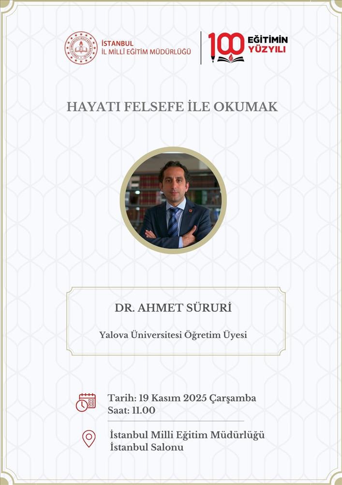 19 Kasım 2025 Çarşamba günü İstanbul İl Millî Eğitim Müdürlüğü İstanbul Salonu'nda gerçekleştirilen etkinlikte Dr. Süruri, “Hayatı Felsefe ile Okumak” başlıklı bir konferans verdi.