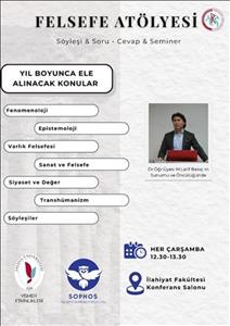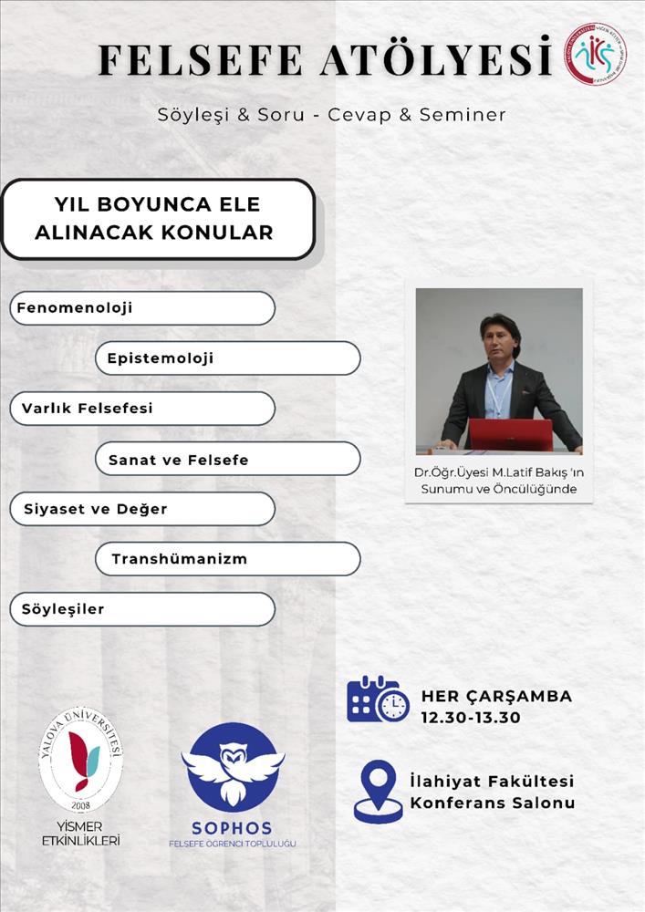 Haftalık Felsefe Atölyesi seminerlerinin ilk üç atölye çalışması gerçekleştirildi. Fakültemiz ögretim üyesi Dr. M. Latif BAKIS tarafından tertiplenen seminere üniversitemiz ögrenci kulüplerinden Sophos Felsefe Topluluğu da katkı verdi. Varlık felsefesi ve diğer belirlenmiş konularla haftalık olarak devam edecek olan atölye calışmalarında zaman zaman konuk akademsiyenlerin de seminerleri olacaktır.