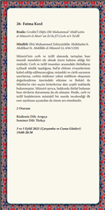 İslam ilim geleneğinin önemli hadis hafızlarından Ebû Muhammed Zekiyyüddîn el-Münzirî'nin (ö. 656/1258) "Cevâbü’l-Hâfız Ebî Muhammed ‘Abdi’l‘azîm el-Münzirî el-Mısrî ‘an Es’ile fi’l-cerh ve’t-ta‘dîl" başlıklı eseri, geçtiğimiz haftalarda Fatih Sahn-ı Seman Araştırma Merkezinde düzenlenen Risale Günler programında fakültemiz öğretim üyesi Doç. Dr. Fatma Kızıl tarafından okutuldu.