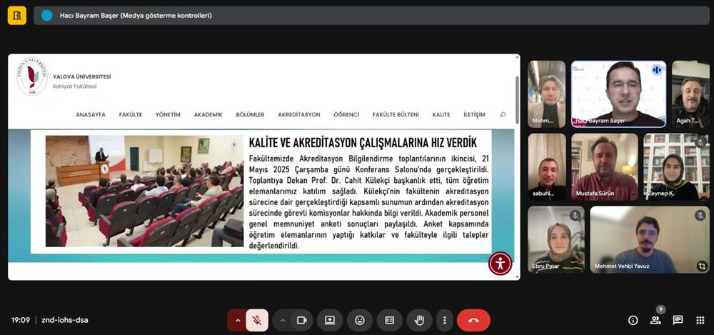 Fakültemizde Kalite ve Akreditasyon çalışmaları kapsamında Yönetim Sistemini Geliştirme Komisyonu üçüncü toplantısı gerçekleştirildi. 8 Aralık 2025 Pazartesi günü saat 19:00’da online olarak düzenlenen toplantıya komisyon üyeleri katılım sağladı. Toplantıda komisyonun görev alanlarıyla ilgili çalışmalarda gelinen son nokta değerlendirildi. İdari ve akademik personelin kurumsal çalışmalara katılımı ve memnuniyetlerinin tespiti ile ilgili çalışmalara hız verilmesi gerektiği vurgulandı. Sene sonu olması hasebiyle Yönetim Sistemini Geliştirme Komisyonu 2025 yılı sene sonu faaliyet raporu hazırlanmasıyla ilgili hususlar görüşüldü. Toplantı, üyelerin soru, görüş ve önerileri ile son buldu.